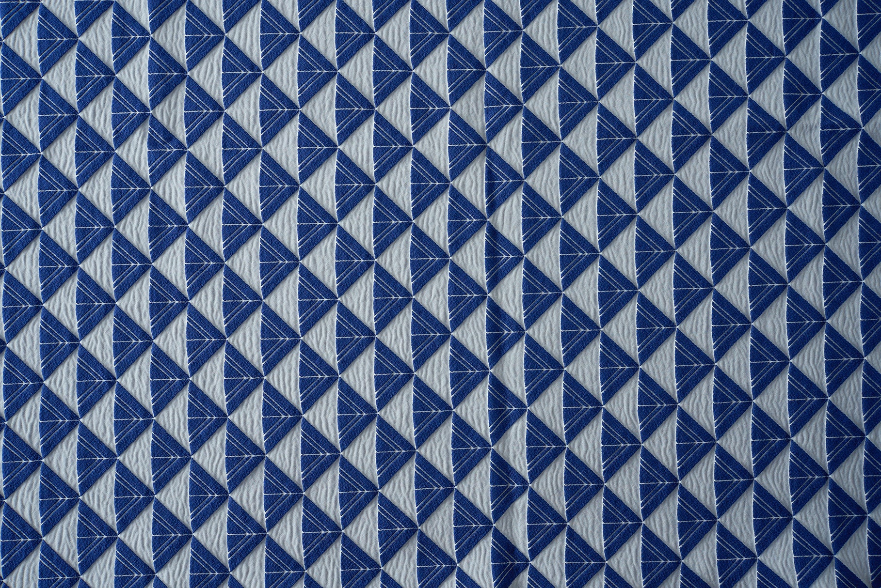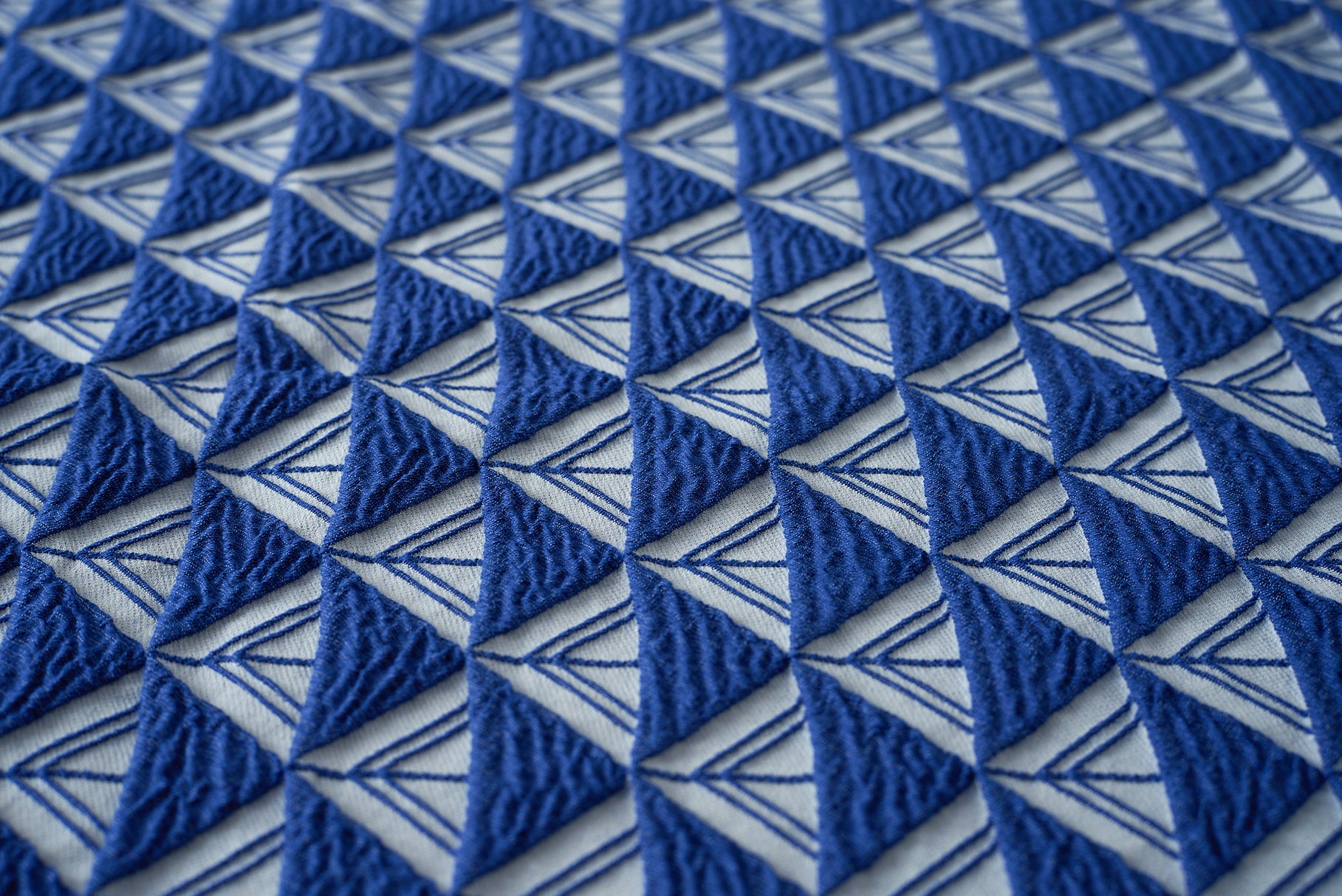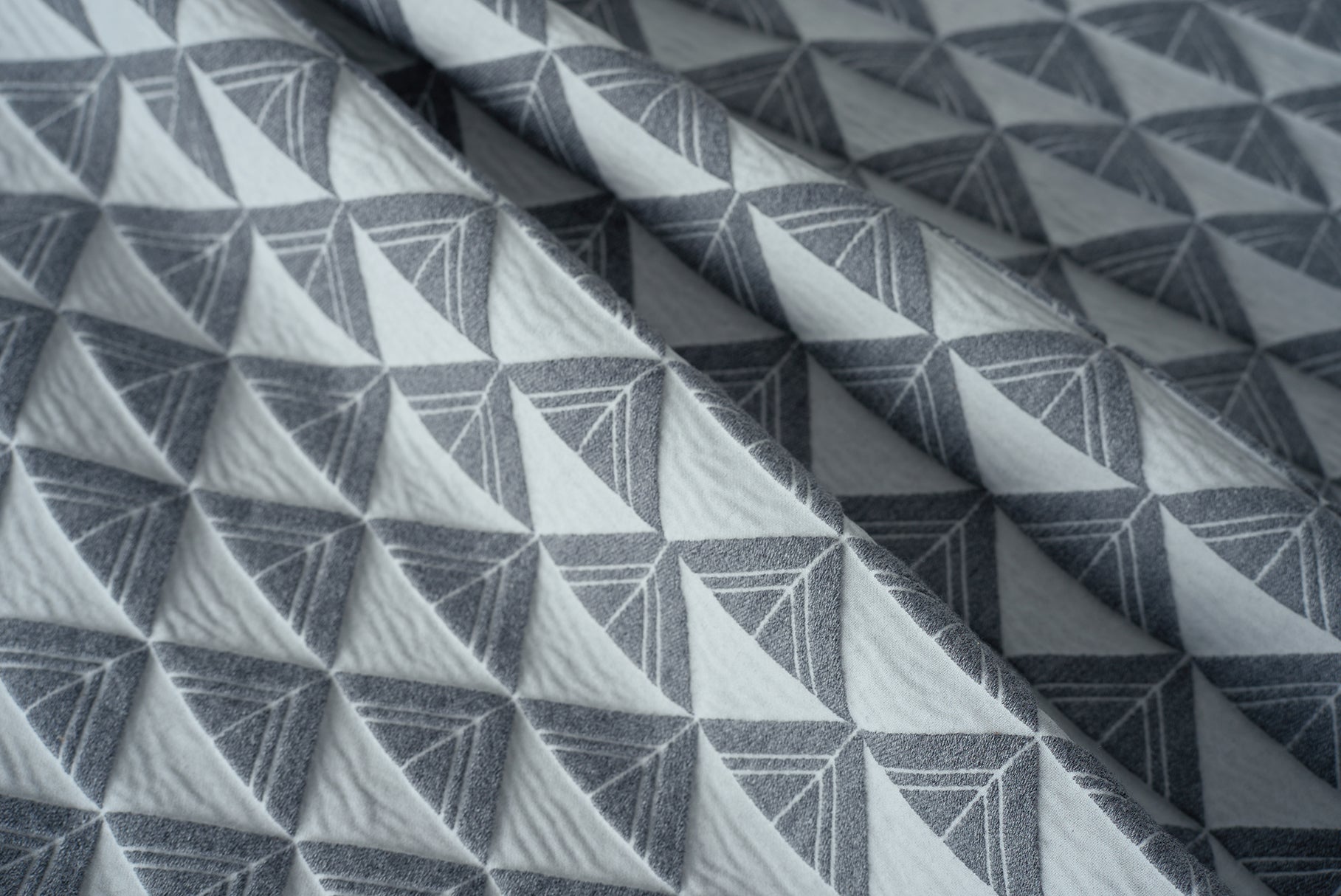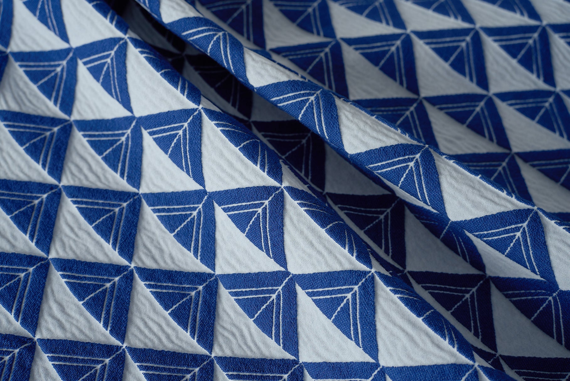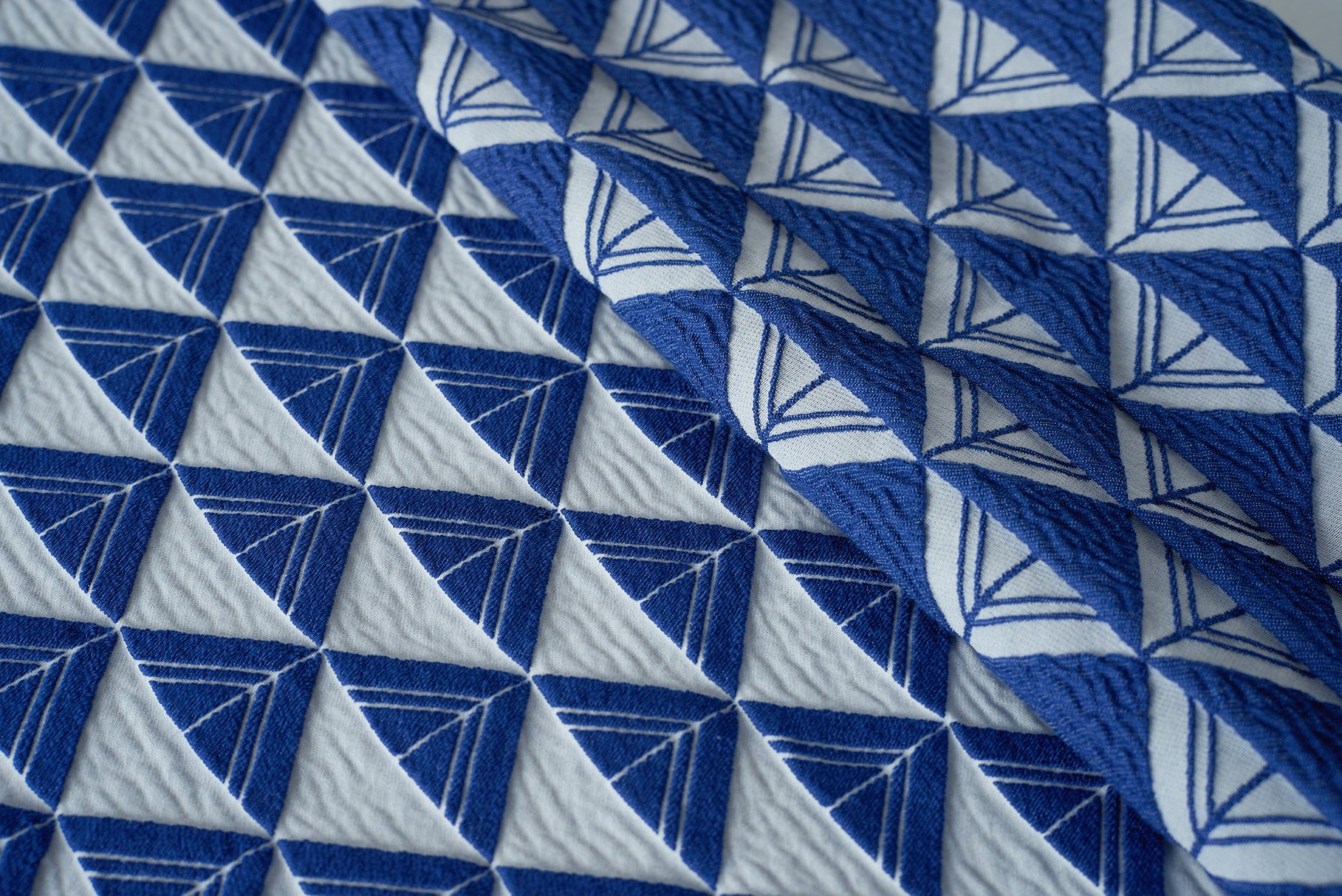 うろこのような、ヨットのような。テントのような、木々のような。和柄のような、北欧っぽい柄のような。ロットによって、生地のしわ感が異なります。